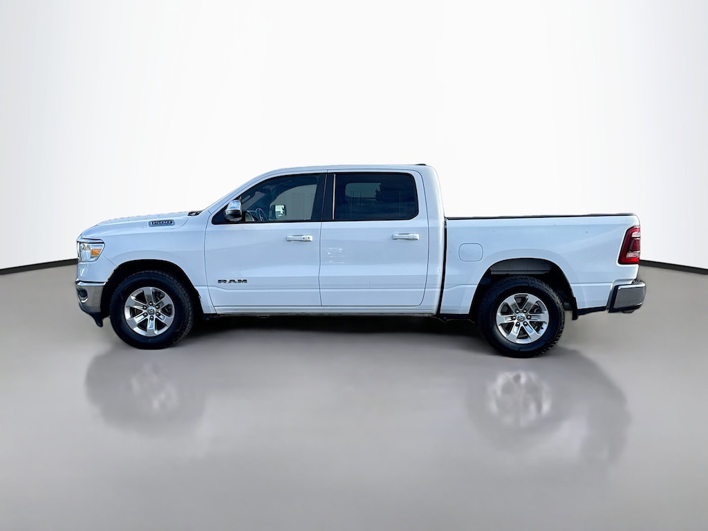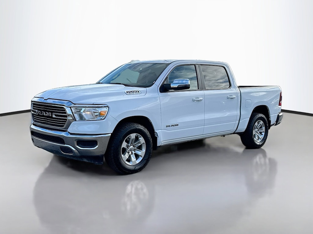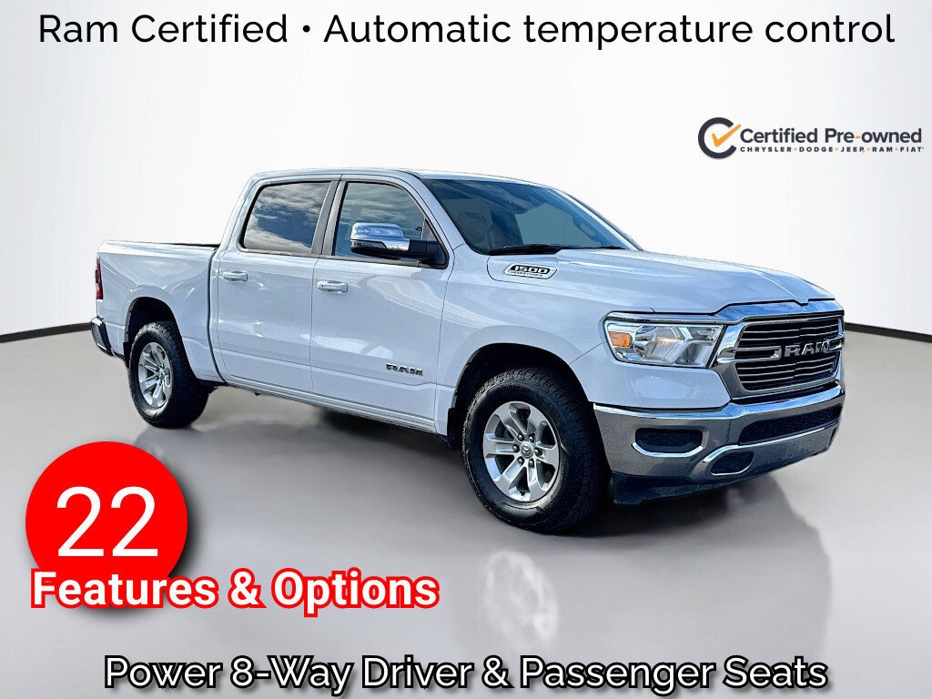 Multi-Point Inspection, w/ Oil Change, Smog Completed, & Full Vehicle Detail Insided & Out, Wiper Blades are New all around, Cabin Air Filter is New, Engine Air Filter is New, Certified Pre-Owned Gold Certified, 10 Speakers, 3 Rear Seat Head Restraints, 3.21 Rear Axle Ratio, 4 Way Front Headrests, 4-Wheel Disc Brakes, 48V Belt Starter Generator, 4G LTE Wi-Fi Hot Spot, ABS brakes, Air Conditioning, Alloy wheels, AM/FM radio: SiriusXM with 360L, Apple CarPlay, Apple CarPlay/Android Auto, Audio memory, Auto-dimming door mirrors, Auto-Dimming Exterior Driver Mirror, Auto-dimming Rear-View mirror, Automatic temperature control, Brake assist, Bumpers: chrome, Chrome Exterior Mirrors, Compass, Connected Travel & Traffic Services, Connectivity - US/Canada, Convex Wide-Angle Exterior Mirror Insert, Delay-off headlights, Driver door bin, Driver Seat Memory, Driver vanity mirror, Dual front impact airbags, Dual front side impact airbags, Electronic Stability Control, Exterior Mirrors Courtesy Lamps, Exterior Mirrors w/Heating Element, Exterior Mirrors w/Memory, Exterior Mirrors w/Supplemental Signals, For Details, Visit DriveUconnect.com, For More Info, Call 800-643-2112, Front anti-roll bar, Front Center Armrest w/Storage, Front dual zone A/C, Front fog lights, Front License Plate Bracket, Front reading lights, Front Seat Back Map Pockets, Front wheel independent suspension, Fully automatic headlights, Garage door transmitter, Global Telematics Box Module (TBM), Google Android Auto, GPS Navigation, HD Radio, Heated door mirrors, Heated Front Seats, Heated front seats, Heated Steering Wheel, Heated steering wheel, Illuminated entry, Integrated Voice Command w/Bluetooth, Leather steering wheel, Leather Trim 40/20/40 Bench Seat, Low tire pressure warning, Manufacturer's Statement of Origin, Memory seat, Navigation System, Occupant sensing airbag, Outside temperature display, Overhead airbag, Overhead console, Panic alarm, ParkView Rear Back-Up Camera, Passenger door bin, Passenger vanity mirror, Power 2-Way Driver Lumbar Adjust, Power 2-Way Passenger Lumbar Adjust, Power 8-Way Driver & Passenger Seats, Power door mirrors, Power driver seat, Power passenger seat, Power steering, Power windows, Power-Folding Mirrors, Quick Order Package 27H Laramie, Radio data system, Radio: Uconnect 5 Nav w/8.4" Display, RAM Grille Badge - Chrome, Rear 60/40 Folding Seat, Rear anti-roll bar, Rear seat center armrest, Rear step bumper, Remote keyless entry, Security system, SiriusXM Radio Service, SiriusXM w/360L, Speed control, Split folding rear seat, Steering wheel mounted audio controls, Tachometer, Telescoping steering wheel, Tilt steering wheel, Traction control, Trip computer, Turn signal indicator mirrors, USB Host Flip, Variably intermittent wipers, Ventilated Front Seats, Ventilated front seats, Voltmeter, Wheels: 18" x 8" Aluminum Base Painted.